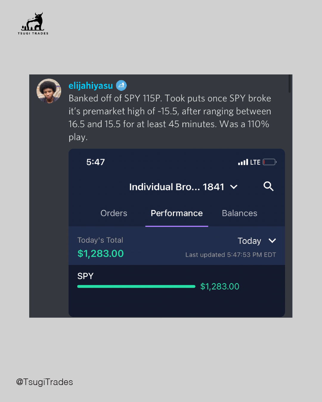Elijah Made $1200+ on $SPY after learning from our Team! Self suffiency is key. I love to see members taking thier own convicted trades!